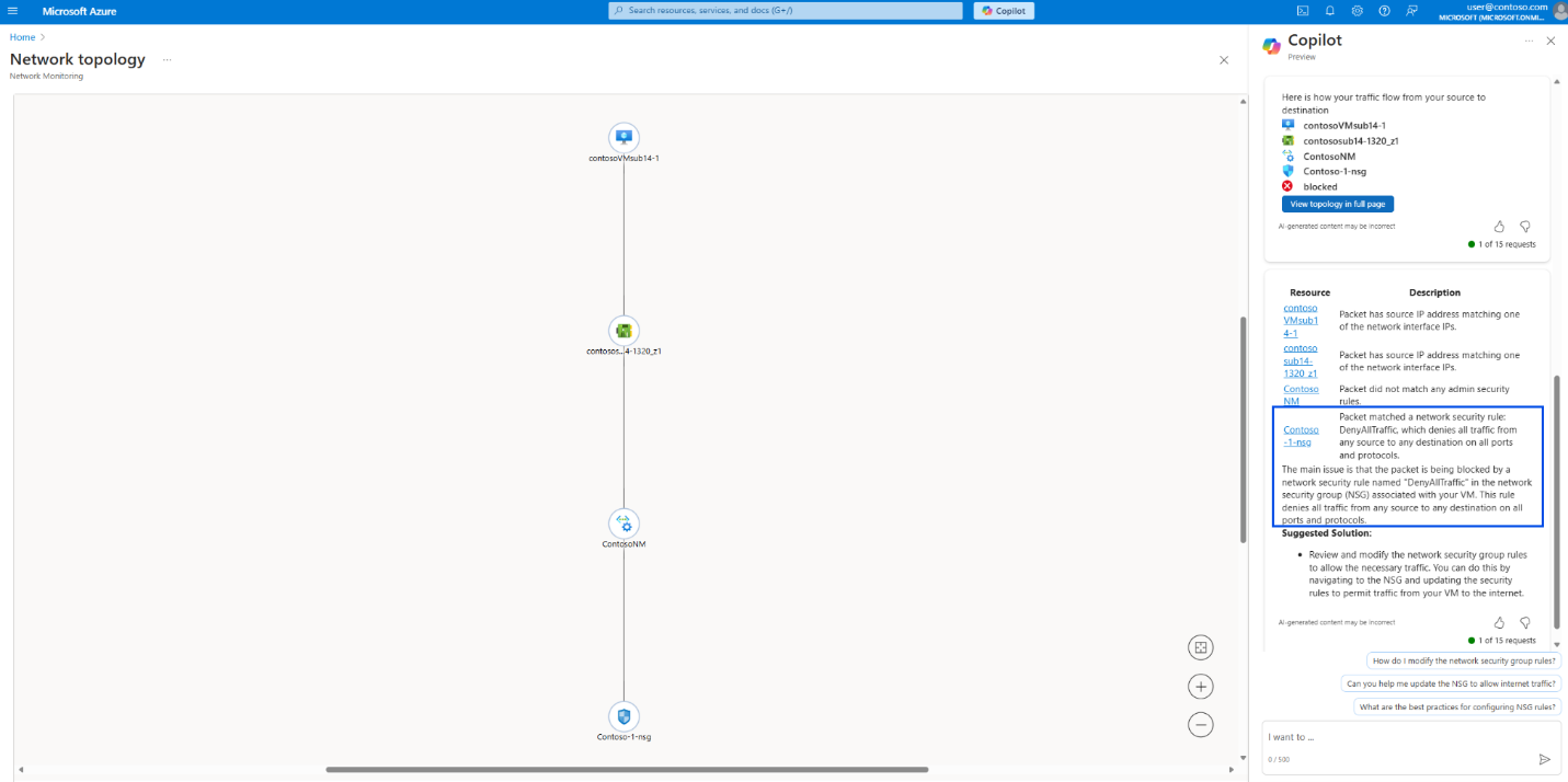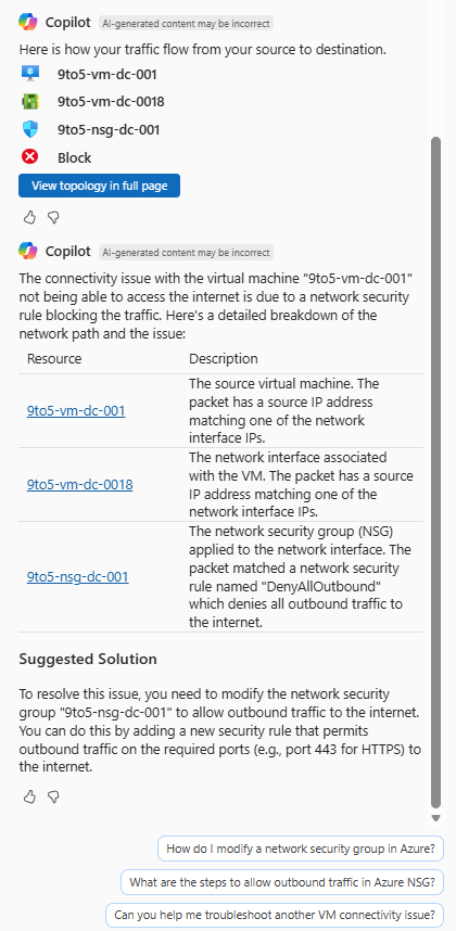 This example shows how Copilot in Azure can be used to quickly narrow down a common networking issue, without having to manually work through multiple Network Watcher tools.