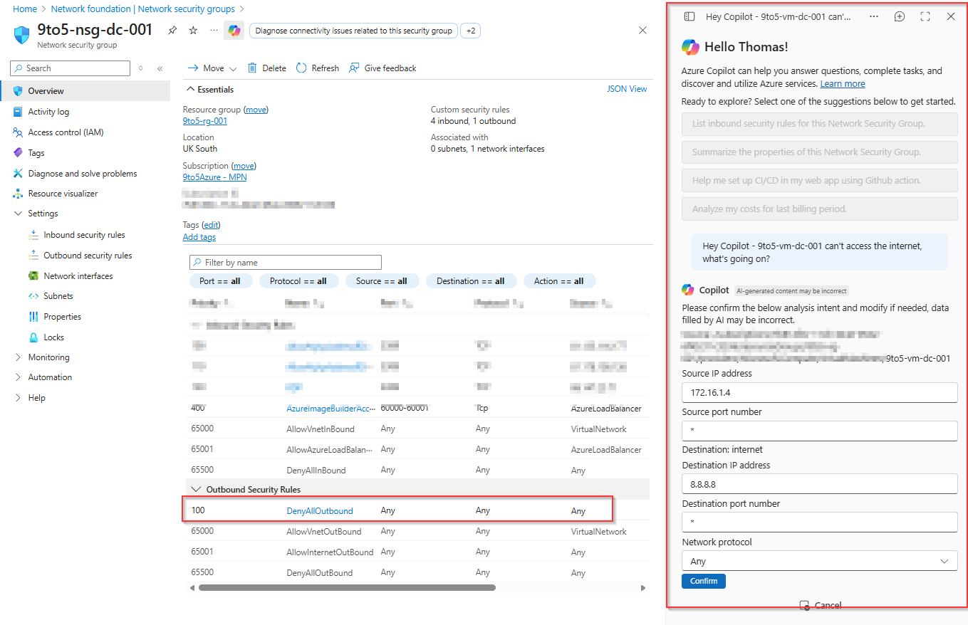 - Copilot identifies the virtual machine, attached NIC, subnet and associated NSGs.